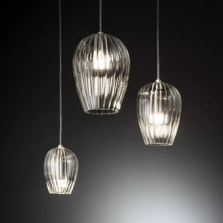 ALBUM - Lumiera 3 luci Pendolino è una sospensione composta da un rosone di diametro 23 cm che può essere a scelta con finitura a specchio o in colore bianco, a cui sono appesi tre diffusori di diametri diversi e rispettivamente 9 alto 11 cm, 10 alto 14 cm e 13 alto 17 cm, realizzati in vetro trasparente, rigato o in una particolare colorazione titanio, soffiato e lavorato a mano. Ogni sorgente luminosa può utilizzare lampadine Led con attacco G9 da 3,8w non incluse, per una resa complessiva di 1410lm. Funzionante con corrente di rete 220 v questa sospensione è ideale per l'utilizzo sopra tavolo sia in sala che in cucina.