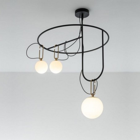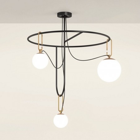 ARTEMIDE – Nh S4 Circulaire è una sospensione dove gli elementi di base sono sfere in vetro soffiato bianco, due di diametro 14 cm e una di diametro 22 cm con anelli in ottone spazzolato, collocate su una strutture che le sostiene e permette di portare le luci nello spazio. La lampada costruita volutamente con dei materiali in perfetta sintesi tra tradizione e innovazione, è dotata di due portalampada E14 che permettono di utilizzare lampadine Led da 5w e un portalampada E27 che permette di utilizzare una lampadina Led da 15w escluse.