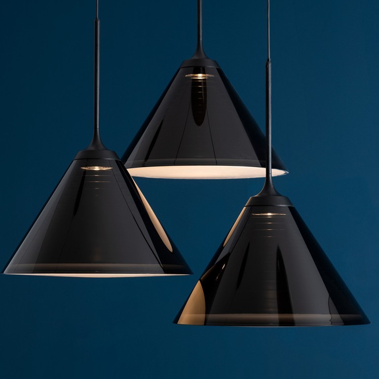 ARTEMIDE – Look at Me 35 Cluster è una sospensioni studiata per garantire la massima efficienza e comfort luminoso, grazie a due lenti poste agli estremi del corpo del diffusore. La luce emessa dalle tre sorgenti LED, da 20w per un totale di 1905lm con temperatura colore 3000°K, è perfettamente controllata all’interno del cono, il fascio disegnato dalla lente primaria cade esattamente sulla superficie della lente inferiore che apre l’emissione. La luce non viene quindi diffusa nell’ambiente attraverso il cono nero ma ritagliata con precisione per intercettarne il profilo a scalini ed animare con linee di luce il suo volume scuro.