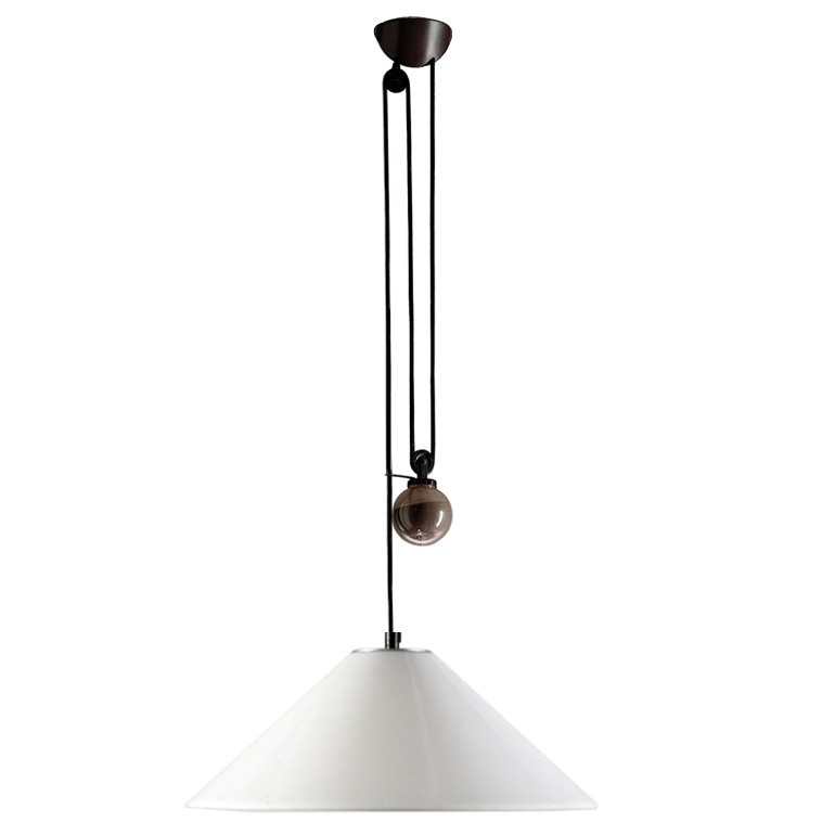 ARTEMIDE – Aggregato, lampada a saliscendi design Enzo Mari e Giancarlo Fassina, è caratterizzata da un contrappeso a sfera e da un rosone in resina termoplastica e metallo verniciato, mentre i diffusori, che possono essere a scelta di forma sferica o conica in metacrilato opalino o in lamiera conica con finitura color grigio antracite, sono disponibili in differenti dimensioni. Aggregato dispone di un portalampada E27 che permette di utilizzare sia lampadine Led da 15w che lampadine di vecchio tipo alogene fino a 77w.