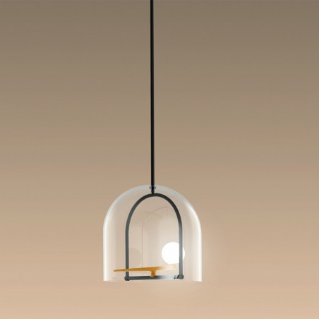 ARTEMIDE - Yanzi sospensione è una leggera lampada formata da una campana di vetro al cui interno è racchiusa un iconica rondine dal corpo in ottone spazzolato il cui capo è formato da una sfera in vetro bianco che racchiude la luce. Una sensibilità straordinaria nell'accostamento di materialità calde e fredde, essenziali ma al tempo stesso ricercate. Yanzi è un sospensione con cui si può dare un tocco di originalità agli spazzi, che si animano così di poesia ed eleganza. Yanzi è a LED integrato 10w 3000K 640lm CRI 90.