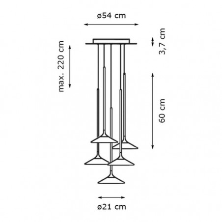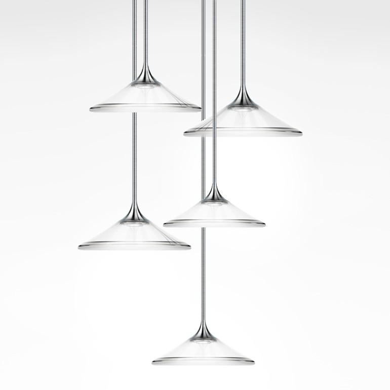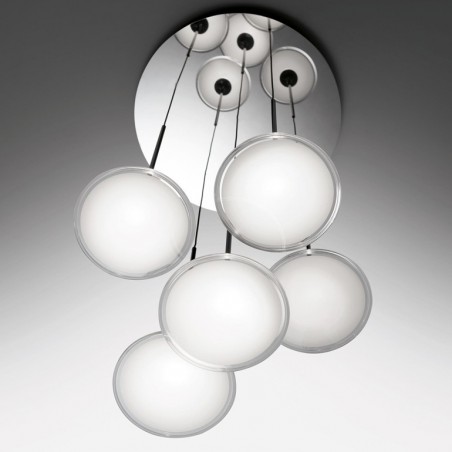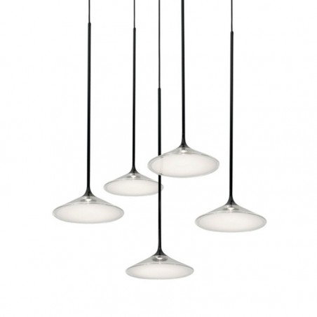 ARTEMIDE - Orsa Cluster 5, è un’elegante lampada a sospensione con cinque sorgenti luminose i cui elementi sono semplificati al massimo per permettere alla luce di delineare il volume stesso dell’oggetto, le cui strutture di alluminio sono appositamente progettate per dissolvere il calore, mentre i sottili steli di metallo si allargano all’estremità inferiore per creare lo spazio per i 5 Led da 8,5w con temperatura colore 3000K e una resa totale di 2810lm, Le sorgenti luminose sono coperte da un diffusore in metacrilato il cui stile e finitura assicura che la fonte di luce rimanga invisibile, trasformando le lampade in dischi di luce sospesi. Oggetto elegante e minimale, Orsa Cluster 5 è concepito per essere utilizzato sia singolarmente sia come parte di un’installazione più ampia.