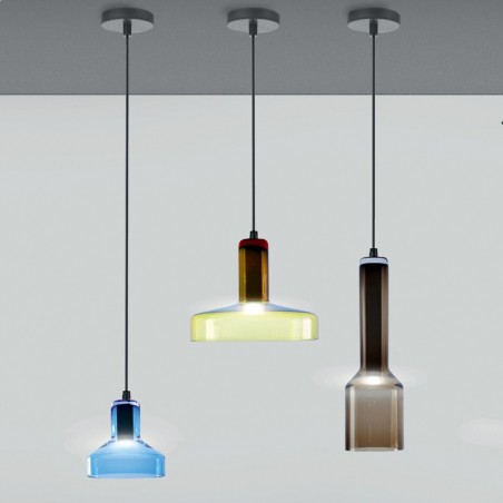 ARTEMIDE – Stablight C sospensione, disponibile con struttura in colore nero e tre differenti colori del vetro, acquamarina, marrone o verde ambra, è prodotta attraverso una tecnologia di tradizione boema, processo produttivo che dimostra la straordinaria capacità dei mastri vetrai che si tramandano la loro esperienza da generazione in generazione. Stablight C, che fa parte di una famiglia di lampade le cui forme diverse dei vetri rendono possibile la creazione di composizioni e scenari luminosi unici, è dotata di portalampada GU10 che permette l’utilizzo di lampadine Led da 6,8w 36° PAR non inclusa.