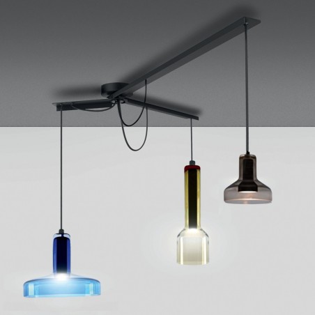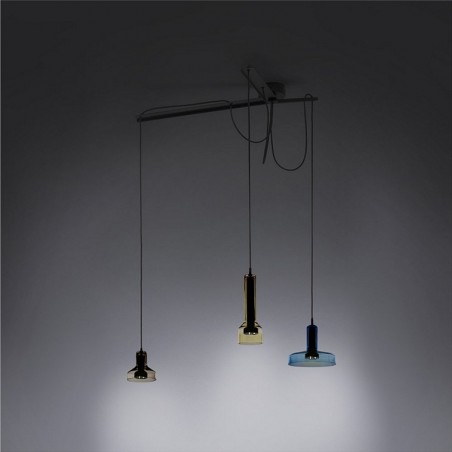ARTEMIDE – Stablight sospensione, disponibile con struttura in colore alluminio verniciato nero e tre vetri differenti per forma, con possibilità di sceglierli in color acquamarina, marrone, verde ambra, oppure con un vetro per colore e precisamente Stablight A marrone, Stablight B verde ambra, Stablight C acquamarina, sono prodotti attraverso una tecnologia di tradizione boema, processo produttivo che dimostra la straordinaria capacità dei mastri vetrai che si tramandano la loro esperienza da generazione in generazione. Stablight, che fa parte di una famiglia di lampade le cui forme diverse dei vetri rendono possibile la creazione di composizioni e scenari luminosi unici, è dotata di tre portalampada GU10 che permettono l’utilizzo di tre lampadine Led da 6,8w 36° PAR non incluse.