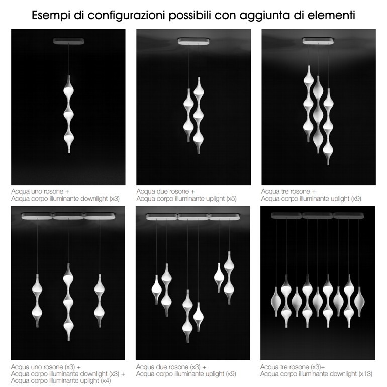 CINI&NILS – Acqua Due è una sospensione particolare e molto decorativa composta da un rosone e due elementi illuminanti che oltre ad essere disponibile in diverse finiture di colore possono essere a scelta Uplight, cioè con luce indiretta e riflessa rivolta verso l’alto, o Downlight, cioè diretta e rivolta verso il basso. Agli elementi illuminanti base di Acqua Due, che integrano un Led dimmerabile da 5,6w 2800K 650lm CRI 95 ciascuno, è possibile aggiunti altri elementi, acquistabili separatamente, vedi Acqua elemento aggiuntivo, fino a un massimo di 10 elementi totale, compresi quelli iniziali già in dotazione. Una lampada quindi personalizzabile e conformabile a piacere secondo le proprie esigenze e gusti.