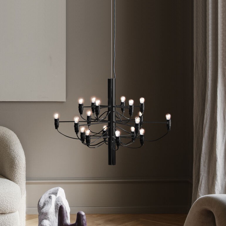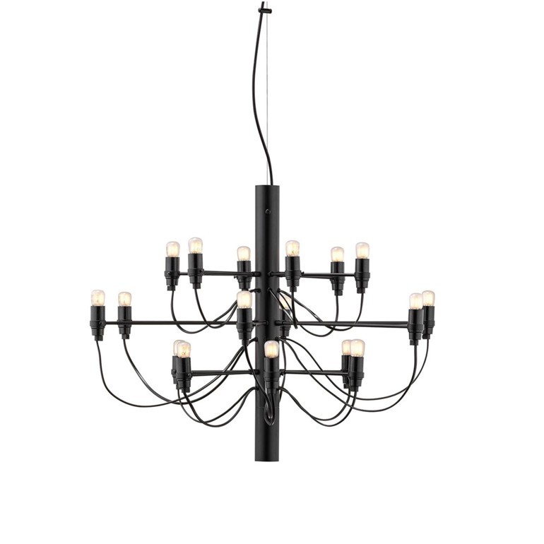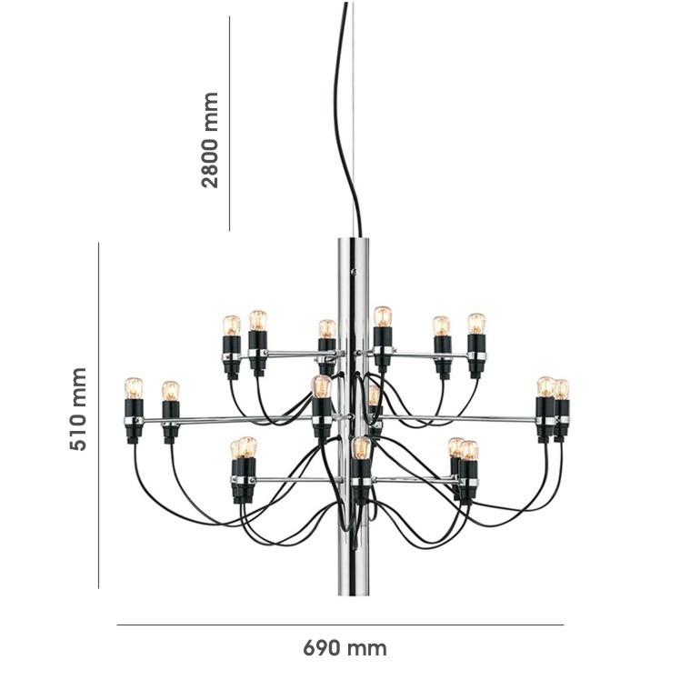 FLOS – 2097/18 ideata da Gino Sarfatti, è realizzata con una struttura in metallo cromato, dorato o nera, con lampadine e relativi cavi di alimentazione lasciati volutamente a vista. I portalampada sono di tipo E14 e permettono di utilizzare vecchie lampadine alogene da 15w o le più moderne e performanti lampadine Led da 2,7w smerigliate o da 2w trasparenti a scelta incluse nella confezione. Il fascino di questa lampada sta nel suo design di estrema semplicità che modernizza il classico concetto di lampadario porta candele di un tempo.