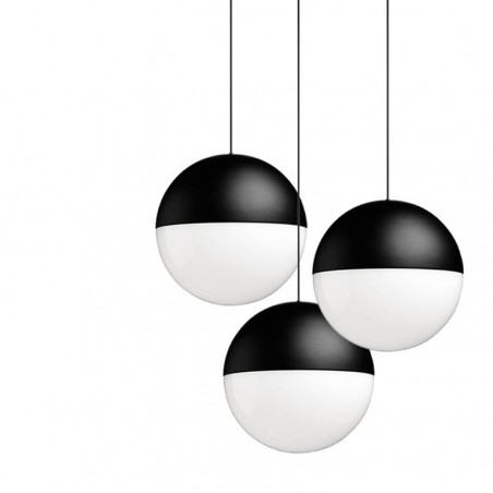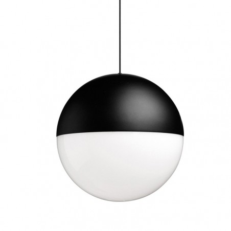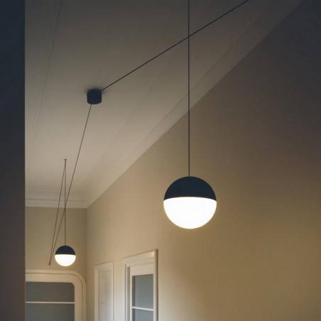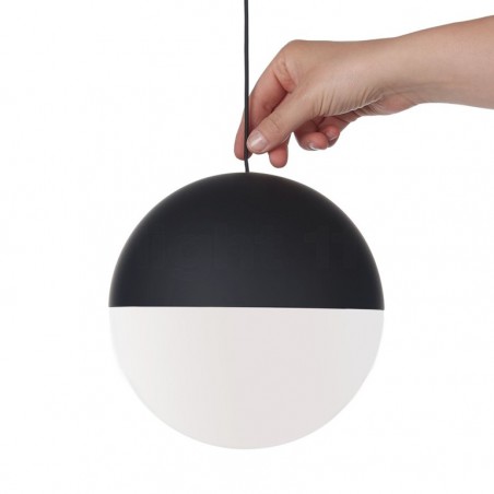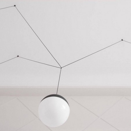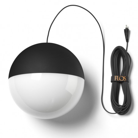 FLOS – String Light testa a sfera è un apparecchio di illuminazione a sospensione a luce diffusa, con corpo in alluminio pressofuso verniciato nero opaco e rivestimento soft touch trasparente, combinato con un diffusore ottico in policarbonato opale. Disponibile con cavo coassiale rinforzato in Kevlar da 12 o 22 metri a scelta, per il funzionamento la lampada necessita del rosone parete/soffitto, oppure del Floor Switch, accessori che riescono ad alimentare fino a due fonti luminose e che devono essere acquistati separatamente. La versione con 12 metri di cavo è corredata di 5 ganci, per permettere il posizionamento a piacere del percorso dei fili, mentre quella da 22 metri ne contiene 7. La lampada è dotata di 1 Led Array 26W, 2700 K, 1910 lumen CRI 90, mentre la funzione on off avviene semplicemente premendo tra le dita il cavo in prossimità del corpo lampada. Gestione on/off e dimmerazione possibili attraverso applicazione di controllo remoto Bluetooth Android e Apple. String Light risulta essere un sistema d’illuminazione creativo, con grandi possibilità di personalizzare l’ambiente in cui viene utilizzato. Possiamo infatti partire da un punto luce a parete, in tal caso utilizzando il rosone parete/soffitto, e portare la luce in punti strategici del nostro locale, oppure partendo da una presa, in tal caso utilizzando il Floor Switch che permette oltretutto di raccogliere, avvolgendolo al suo interno, il cavo residuo non utilizzato.