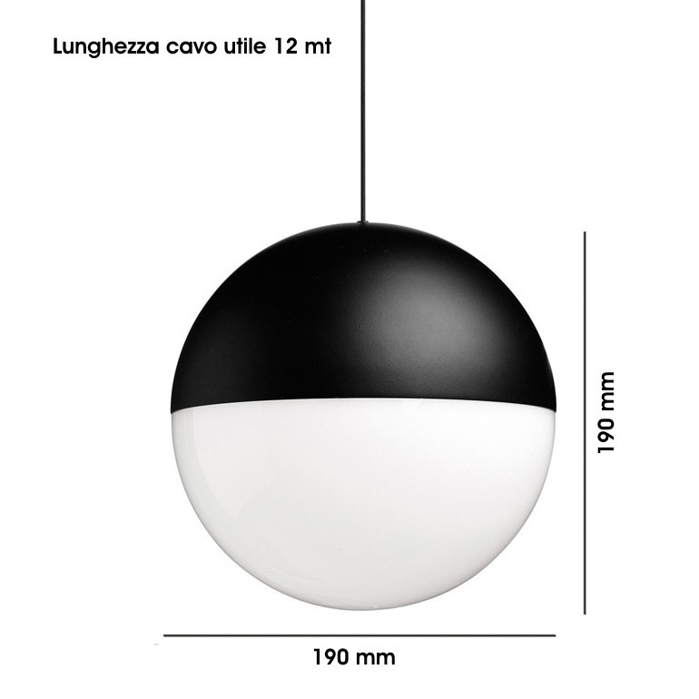 FLOS – String Light testa a sfera è una sospensione a luce diffusa con corpo in alluminio pressofuso verniciato nero opaco combinato con un diffusore ottico in policarbonato opale. Disponibile con cavo da 12 o 22 metri a scelta, per il funzionamento la lampada necessita del rosone parete/soffitto, oppure del Floor Switch, accessori che riescono ad alimentare fino a due fonti luminose e che devono essere acquistati a parte. La versione con 12 metri di cavo è corredata di 5 ganci, mentre quella da 22 metri ne contiene 7. La lampada è dotata di 1 Led Array 26W, 2700 K, 1910 lumen CRI 90 con on off possibile semplicemente premendo tra le dita il cavo in prossimità del corpo lampada. Gestione on/off e dimmerazione possibili anche con applicazione di controllo remoto Bluetooth Android e Apple.