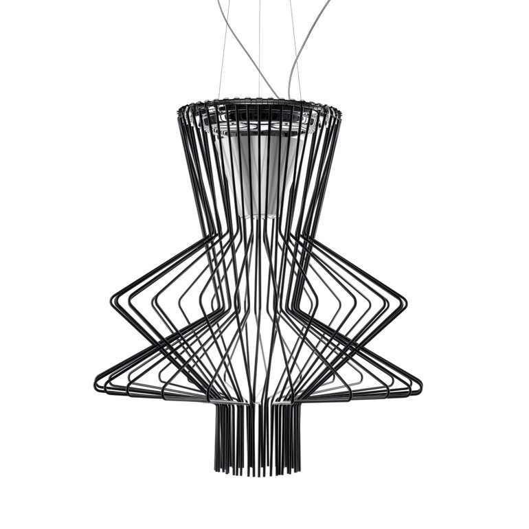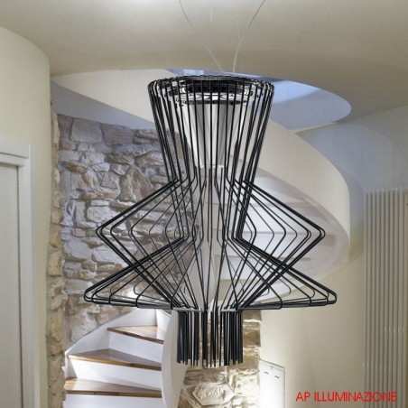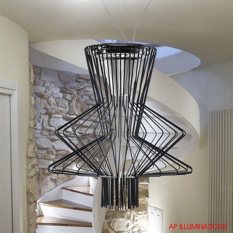 FOSCARINI- Allegro Ritmico Led è caratterizzata da una struttura in metallo cromato sulla quale sono agganciate una serie di aste in alluminio pieno opportunamente sagomate che danno vita e forma alla lampada. Allegro Ritmico Led è dotato di due fonti luminose separate, rispettivamente da 39w COB + 11W Multichip, una rivolta verso l'alto indiretta e diffusa e una verso il basso diretta e puntuale sul piano. Allegro Ritmico Led, che fa parte di una serie di lampade con forme diverse a cui è abbinato uno specifico colore, è in questa versione con finitura in color grafite.