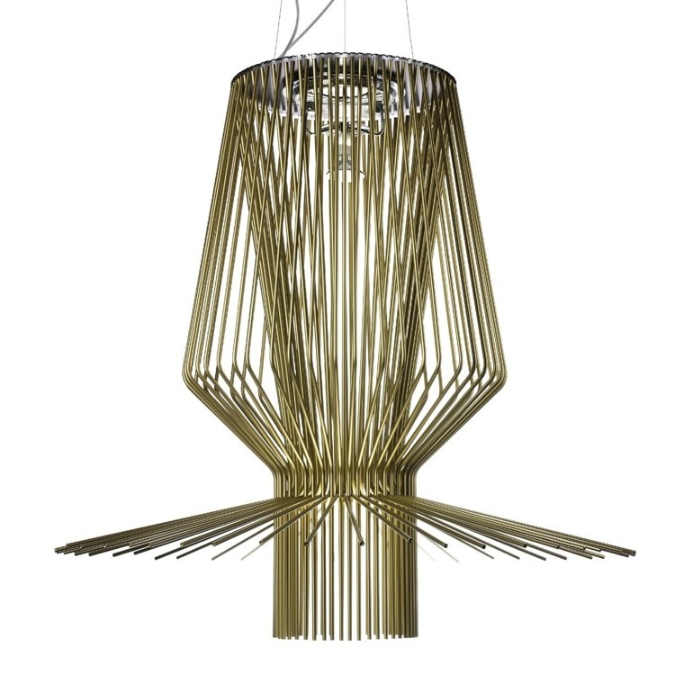 FOSCARINI- Allegro Assai Led è caratterizzata da una struttura in metallo cromato sulla quale sono agganciate una serie di aste in alluminio pieno opportunamente sagomate che danno vita e forma alla lampada. Allegro Assai Led è dotato di due fonti luminose separate, rispettivamente da 39w COB + 11W Multichip, una rivolta verso l'alto indiretta e diffusa e una verso il basso diretta e puntuale sul piano. Allegro Assai Led, che fa parte di una serie di lampade con forme diverse a cui è abbinato uno specifico colore, è in questa versione con finitura in color oro.
