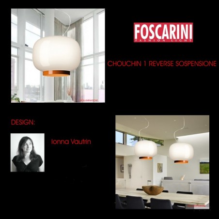FOSCARINI – Chouchin 1 Reverse di Foscarini, progettata da Ionna Vautrin, è una lampade a sospensione realizzate in vetro soffiato, dove la particolarità del design consiste nel piacevole contrasto tra il vetro verniciato e quello bianco. Chouchin 1 Reverse che fa parte di una serie di lampade disponibili in diverse forme e colori, è utilizzabile sia singolarmente che in raggruppamenti, i quali, posizionate sopra tavoli e piani di lavoro riescono a dare luce e nel contempo arredare. Chouchin 1 Reverse, dotata di portalampada E27 che permette di utilizzare un po’ tutte le tipologie di lampadine, è fornita di serie con una a led da 21w ed è utilizzabile negli ambienti più disparati, sia privati che pubblici come bar, ristoranti, negozi e ovunque si voglia creare un atmosfera particolare.