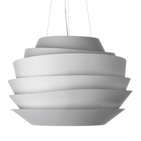 FOSCARINI - Le Soleil è una lampada a sospensione composta da fasce irregolari in policarbonato opaco che agiscono come superficie riflettente all’interno e come diffusore all’esterno. L’utilizzo di un materiale che non fa trasparire la luce, aiuta a creare il particolare effetto luminoso di questa lampada, con fasci di luce proiettati verso l’alto e con un’illuminazione diretta verso il basso, adatta ad evidenziare un’area precisa dello spazio. Il bordo irregolare delle fasce movimenta il volume di Le Soleil con un effetto architettonico e la rende sempre diversa, a seconda del punto di vista dell’osservatore. Le Soleil è in questa versione dotata di tre portalampade E27 per la luce indiretta e diffusa, con la possibilità di utilizzare sia lampadine Alogene fino a 70w o LED retrofit da 25w, più un portalampada GU10 per la luce diretta, che permette di utilizzare una lampadina Led Retrofit da 8w PAR16, tutte le lampadine sono escluse.