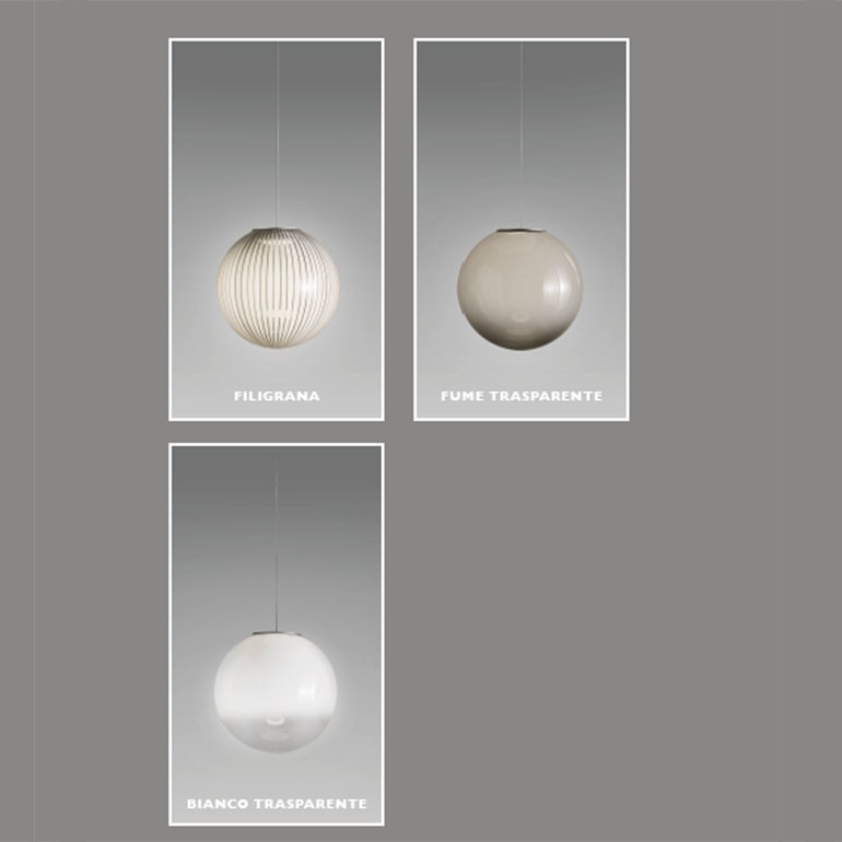 ICONE - Bolla S1 sospensione è una lampada realizzata in alluminio verniciato e vetro soffiato sfumato trasparente o filigrana. La lampada Bolla S1 sospensione oltre a disporre di una luce da 12w 24v 3000°K, è fornita anche di un rosone a soffitto contenente un illuminazione perimetrale sul bordo da 20w 24v 3000°K. La lampada è dimmerabile TRIAC. Particolarità che poi caratterizza ulteriormente questa lampada è il fatto che si ha la possibilità di scegliere per una variante dove la sorgente luminosa pendente può essere regolata senza vincoli e in ogni momento in altezza, grazie a un meccanismo di avvolgimento del cavo.