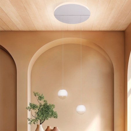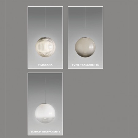 ICONE - Bolla S2 sospensione è una lampada realizzata in alluminio verniciato e vetri soffiati sfumati trasparenti o filigrana. La lampada Bolla S2 sospensione oltre a disporre di due luci da 12w 24v 3000°K, è fornita anche di un rosone a soffitto contenente un illuminazione perimetrale sul bordo da 30w 24v 3000°K. La lampada è dimmerabile TRIAC. Particolarità che poi caratterizza ulteriormente questa lampada è il fatto che si ha la possibilità di scegliere per una variante dove la sorgente luminosa pendente può essere regolata senza vincoli e in ogni momento in altezza, grazie a un meccanismo di avvolgimento del cavo.