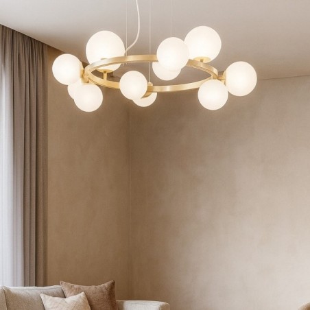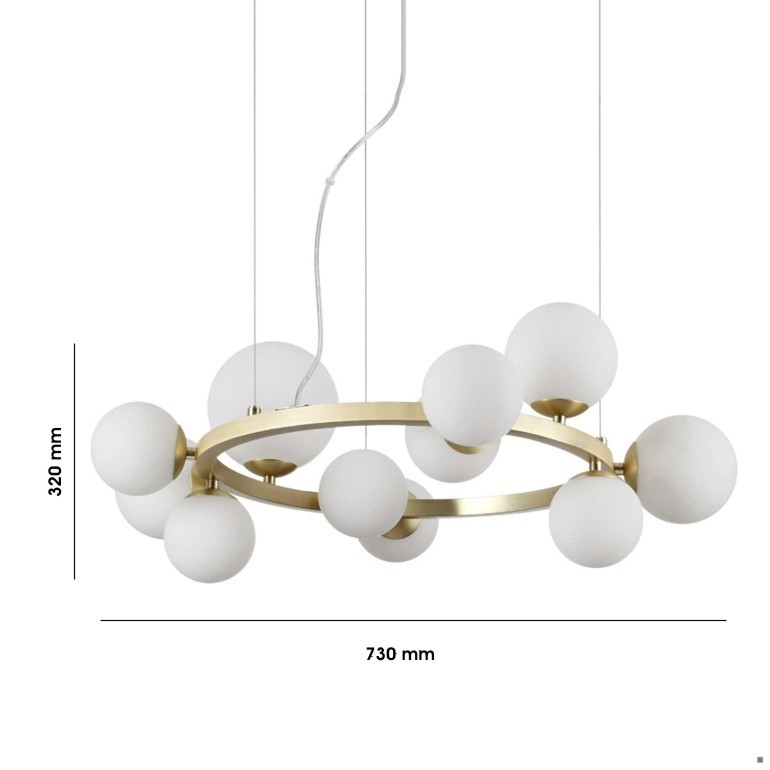 IDEAL LUX - Perlage SP11 si distingue per il suo design contemporaneo e raffinato. La montatura in metallo con struttura circolare a sezione piatta sostiene eleganti sfere in vetro soffiato bianco opale, che aggiungono un tocco di stile unico agli ambienti. I cavi in acciaio regolabili rivestiti in gomma e il cavo elettrico in PVC permettono un'installazione personalizzata, adattandosi a diverse altezze. Progettato per accogliere lampadine LED G9, questo lampadario offre flessibilità nella scelta della potenza luminosa e del colore della luce. La manutenzione è semplice grazie al sistema di fissaggio delle sfere di vetro tramite clip a molla, che permette di rimuoverle facilmente per la pulizia.