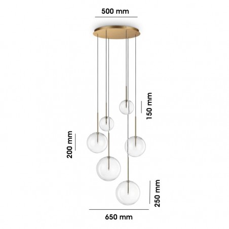 IDEAL LUX - Il lampadario a cascata Equinoxe SP6 di Ideal Lux, nella raffinata variante ottone, è un elemento d’arredo luminoso progettato per ambienti eleganti. Con sei sfere in vetro trasparente di dimensioni variabili (15, 20 e 25 cm) e cavi regolabili, permette di personalizzare l’altezza delle luci, creando configurazioni uniche e affascinanti. La luce diffusa a 3000K, grazie alle lampadine LED G4 incluse, emana un’atmosfera calda e accogliente, mentre i riflessi del vetro trasparente donano un effetto cangiante e magico. Questo lampadario unisce eleganza e funzionalità, ideale per valorizzare salotti, sale da pranzo o hall di lusso.