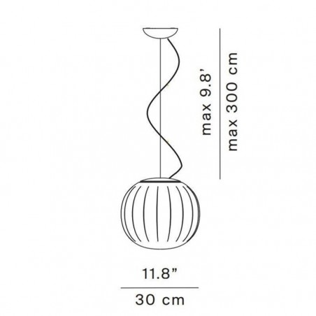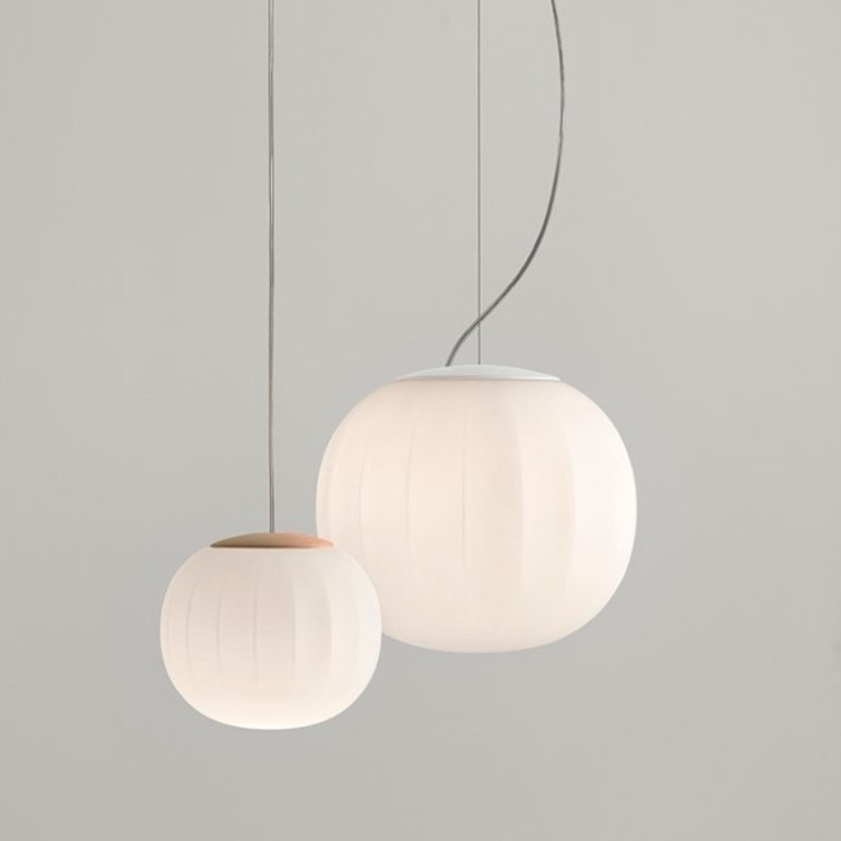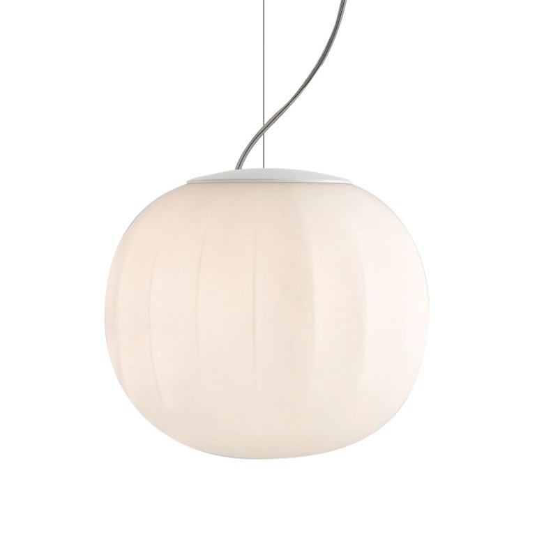 LUCEPLAN - Lita sospensione diametro 30 è una lampada decorativa estremamente versatile dove il diffusore, caratteristica principale di questa lampada, è in vetro soffiato opalino la cui superficie viene scandita dalla ripetizione di lievi cuspidi verticali che svaniscono ai poli. La struttura, che può essere a scelta in metallo verniciato bianco o in ottone, è dotata di un portalampada E27 che permette di utilizzare lampadine alogene da o Led escluse.