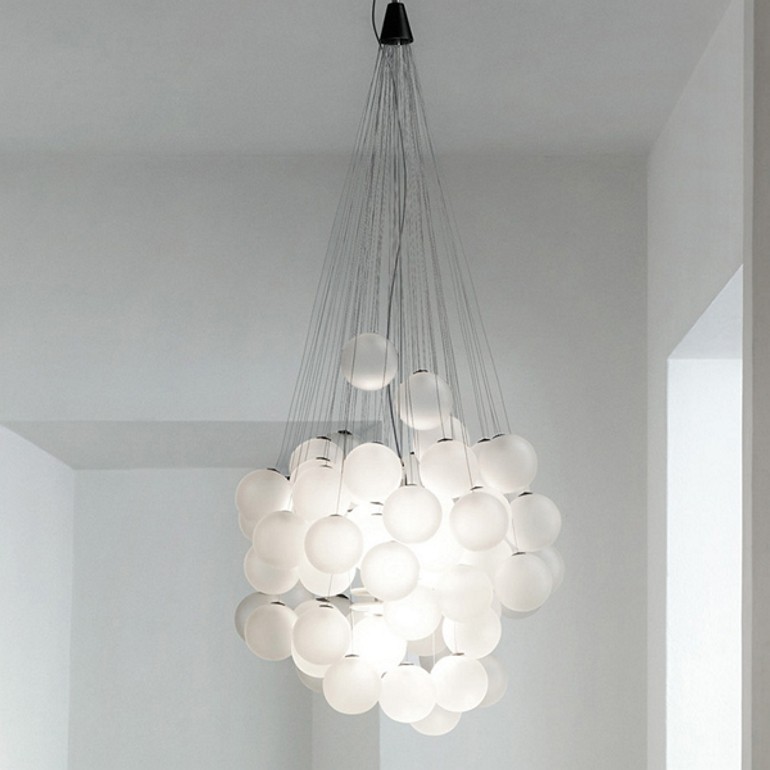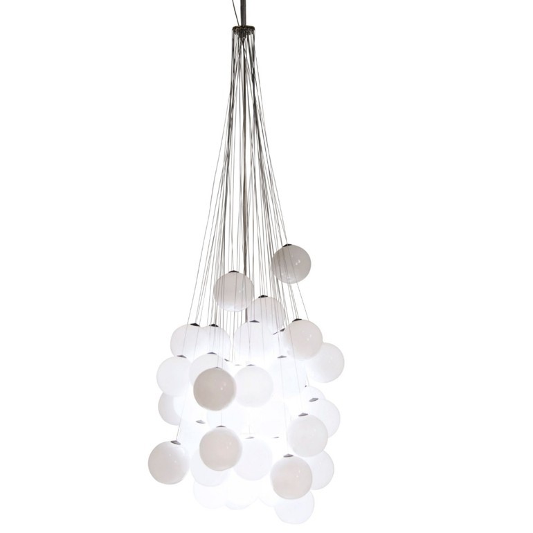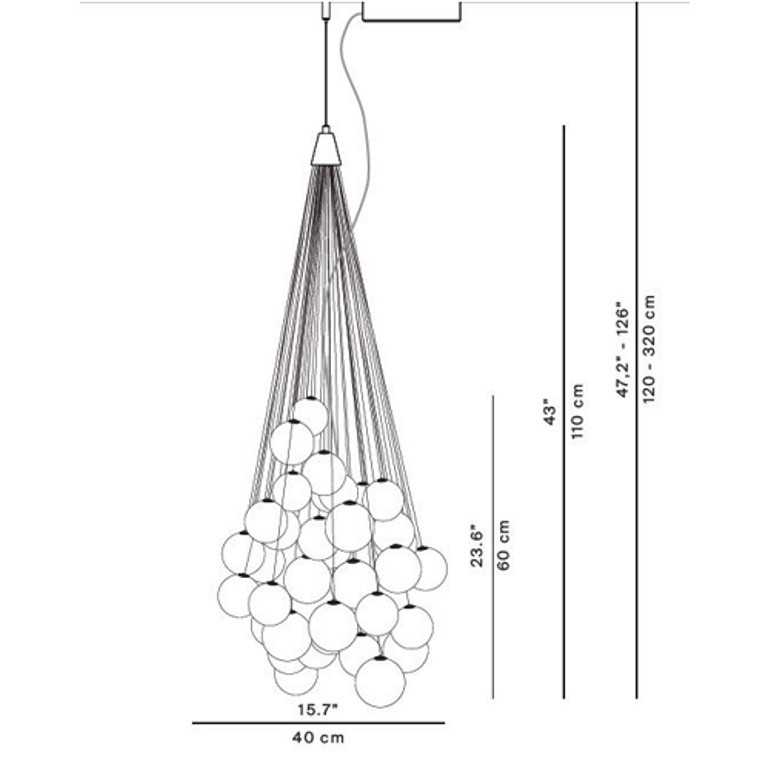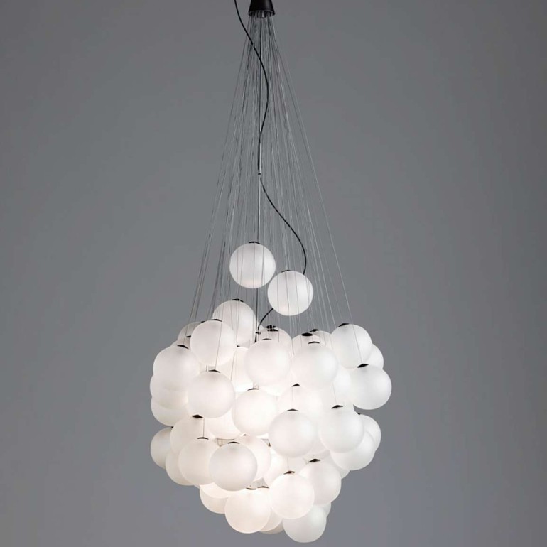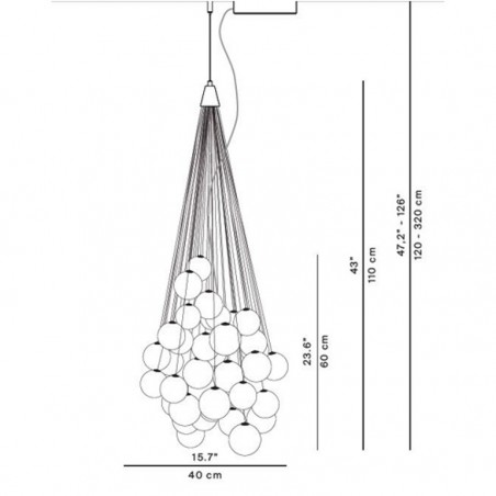 LUCEPLAN - Stochastic, composta da sfere di vetro a diverse altezze, che possono essere in metallizzato o in bianco opalino, in quantità di 48 o 72 pezzi, consente infinite combinazioni, in una sorta di libertà controllata: ogni sfera è collegata a delle astine in acciaio di lunghezze differenti, che vanno agganciate alla struttura secondo la propria creatività. La fonte luminosa, un doppio modulo LED ad alta efficienza da 25w che può essere a scelta 3000K o 2700K, è racchiusa all’interno delle sfere, generando una luce indiretta, calda e soffusa, che si dirige sia verso l’alto che verso il basso e che può essere regolata in intensità tramite un varialuce da inserire nell'impianto e non incluso.