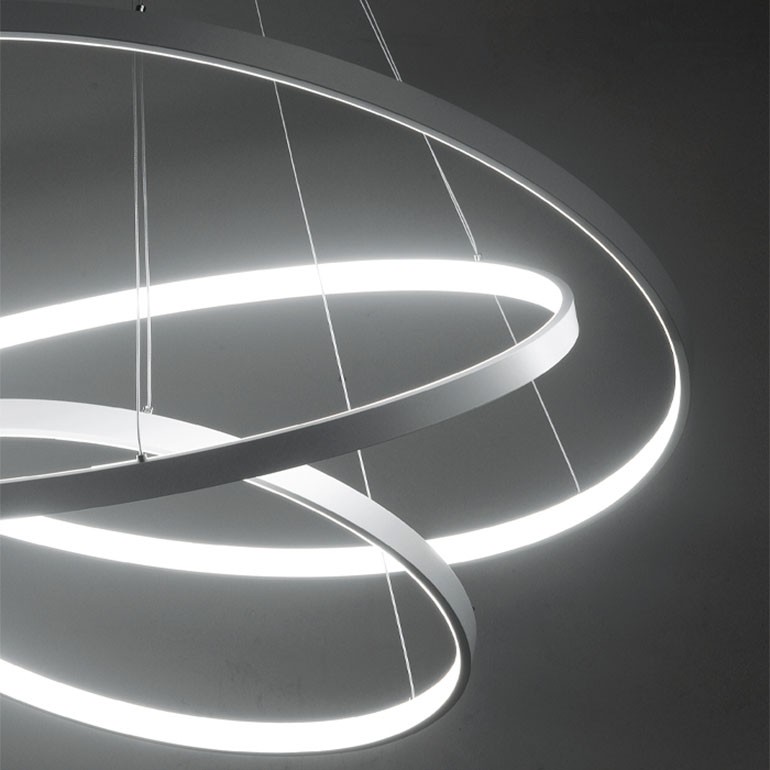 ROSSINI ILLUMINAZIONE - Zerum Multiplo è una lampada a sospensione LED (3000K) dal design sottile e minimal. Struttura ad anelli in alluminio, disponibile nella finitura bianca o nera con diffusori in silicone opale a emissione di luce interna. Costituita da tre anelli di diverse dimensioni, 600 800 e 1000mm, con una potenza complessiva di 95w 4365lm, Zerum Multiplo è ideale in ambienti residenziali, hall, uffici e grandi spazi.