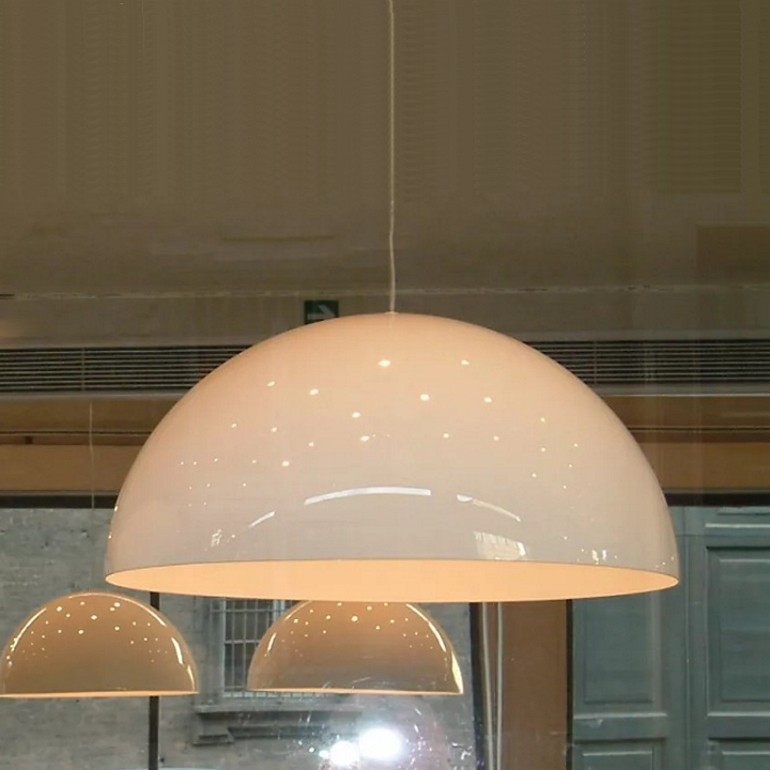 OLUCE - Sonora è la storia di una forma geometrica pura perseguita da Vico Magistretti per quasi trenta anni come un’ossessione. Nata nel 1976 viene eseguita in alluminio tornito e raggiungeva già la dimensione di 100 centimetri, nel 1990 viene proposta in vetro soffiato acidato e nel 2003 in metacrilato. Quest’ultima variante tocca, tre anni dopo, la straordinaria misura di 133 centimetri ponendosi come dimostrazione di eccezionalità tecnologica. Sonora, maldestramente imitata nel mondo intero, è certamente una delle lampade più amate da Magistretti che riconosceva in essa la capacità di illuminare, e soprattutto di caratterizzare, un intero ambiente: sorta di volume contenuto in un altro volume che è la stanza. Disponibile in due dimensioni Sonora PMMA è fornita per la misura da 90 cm. di un portalampada E27 e per la dimensione 133 cm di due portalampade E27 che permettono di utilizzare lampadine Led non incluse.