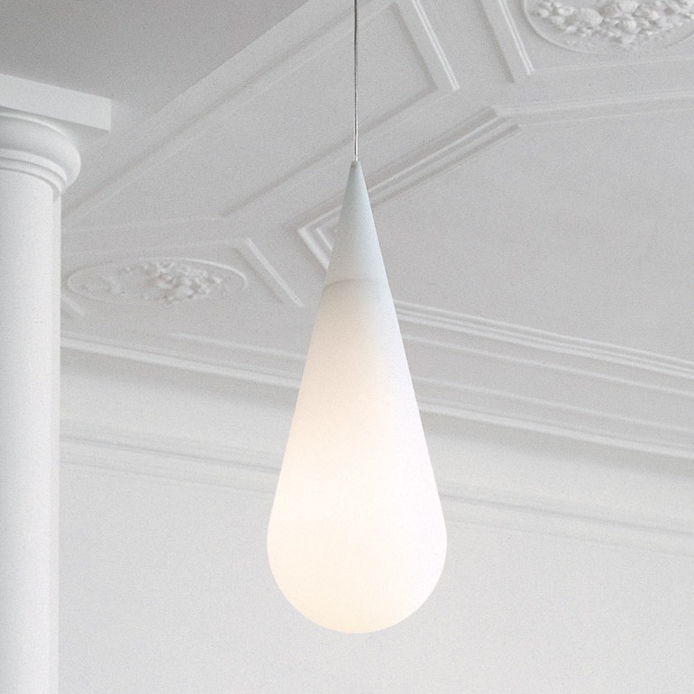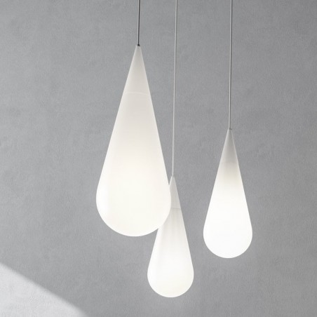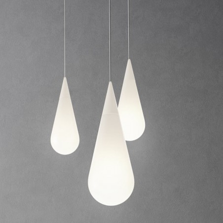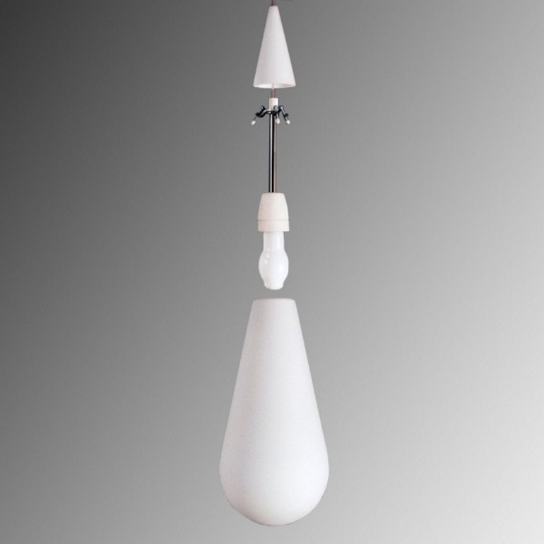 ROTALIANA - Sospensione la cui forma, che richiama quella di una goccia o di un gioiello pendente, è originata da due elementi sovrapposti in vetro che non mostrano discontinuità nell’eleganza e compattezza del segno. La parte superiore di forma conica è riproposta nel rosone, simulando una riflessione speculare sul soffitto. Dotata di portalampada E27 è possibile utilizzare lampadine Led Retrofit di forma tubolare da 15 o 20w non incluse.