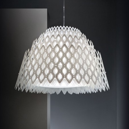 SLAMP – Half Charlotte firmata da Doriana e Massimiliano Fuksas, uno dei più importanti studi di design, è una lampada a sospensione caratterizzata da un diffusore composto da forme esagonali concentriche che creano una prospettiva cangiante in base al punto da cui la si guarda, modellandosi in un unico volume che richiama il nido d’ape e trasformando un elemento bidimensionale in volumi che si moltiplicano all’infinito. Half Charlotte è dotato di un Led integrato da 70w che garantisce un’illuminazione ottimale e confortevole anche in ambienti di grandi dimensioni. Half Charlotte inserita all’interno di qualsiasi arredamento domestico, ma anche in locali pubblici come negozi, ristoranti e bar, armonizza gli spazi e li valorizza, infondendo carattere e personalità all’ambiente.