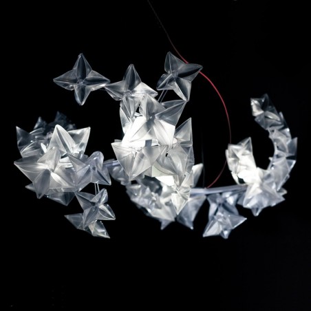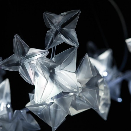 SLAMP – Hanami, design Adriano Rachele per Slamp, è una lampada a sospensione realizzata in Lentiflex, policarbonato e acciaio inossidabile, caratterizzata da una moltitudine di fiori plissettati a mano che celano la sorgente Led da 25W e la diffondono in una miriade di riflessi e bagliori. Versatile e molto particolare questa lampada può valorizzare gli ambienti in cui viene inserita siano essi moderni o classici.