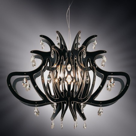 SLAMP- Medusa, lampada fortemente scenografiche che, alla metà degli anni 2000, ha segnato un momento di grande evoluzione stilistica nella produzione di Slamp, è realizzata prevedendo una serie di centine radiali che si aggancia facilmente al cestello centrale, arricchito da preziosi cristalli trasparenti che, rifrangendo la luce della sorgente luminosa, creano riflessioni multiformi nell’ambiente circostante. Dotata di portalampada E27 è possibile l’utilizzo di lampadine Led da 10w non compresa.
