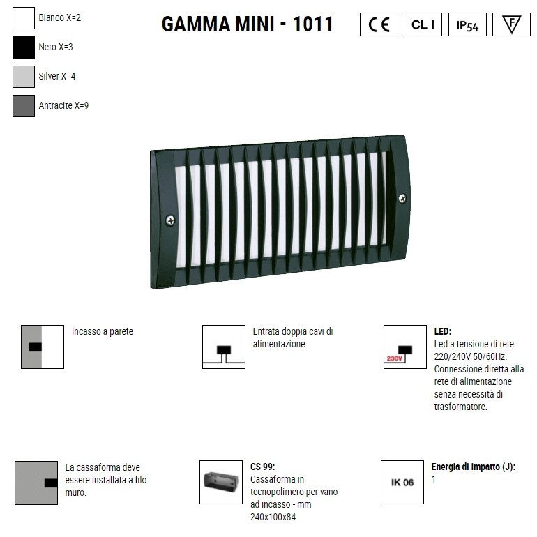 BOLUCE – Gamma Mini 1011 è una lampada per esterno in alluminio, fornita di cassaforma per incasso a parete, disponibile in colori diversi e con l’opzione possibile della versione con Led integrato da 9w 3000K o 4000K 1160lm, oppure con portalampada E14 adatto all’uso di lampadine Alogene da 40w o Led compatibili con dimensioni e spazi interni alla lampada. Mentre nelle versioni Led integrato la sorgente è inclusa, nella versione con portalampada E14 la lampadina è esclusa. Gamma Mini 1011, se istallata correttamente e secondo istruzioni di montaggio, ha un grado IP54 e vi permetterà di illuminare i vostri spazi esterni, il vostro giardino, il terrazzo, la veranda e il vostro outdoor.