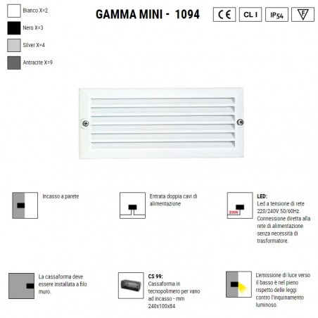 BOLUCE – Gamma Mini 1094 è una lampada per esterno in alluminio, fornita di cassaforma per incasso a parete, disponibile in colori diversi e con l’opzione possibile della versione con Led integrato da 9w 3000K o 4000K 1160lm, oppure con portalampada E14 adatto all’uso di lampadine Alogene da 40w o Led compatibili con dimensioni e spazi interni alla lampada. Mentre nelle versioni Led integrato la sorgente è inclusa, nella versione con portalampada E14 la lampadina è esclusa. Gamma Mini 1094, se istallata correttamente e secondo istruzioni di montaggio, ha un grado IP54 e vi permetterà di illuminare i vostri spazi esterni, il vostro giardino, il terrazzo, la veranda e il vostro outdoor.
