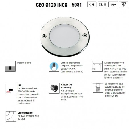BOLUCE – Geo 120 Inox 5081 è una lampada per esterno e interno fornita di cassaforma per incasso a pavimento con portalampada GU10 e lampadina 6w LED a scelta 3000K o 4000K inclusa. Geo 120 Inox 5081 se istallata correttamente e secondo istruzioni di montaggio, ha un grado IP67 e vi permetterà di illuminare i vostri spazi esterni, il vostro giardino, il terrazzo, la veranda e il vostro outdoor, ma anche spazi interni e ambienti come scale, corridoi e disimpegni.