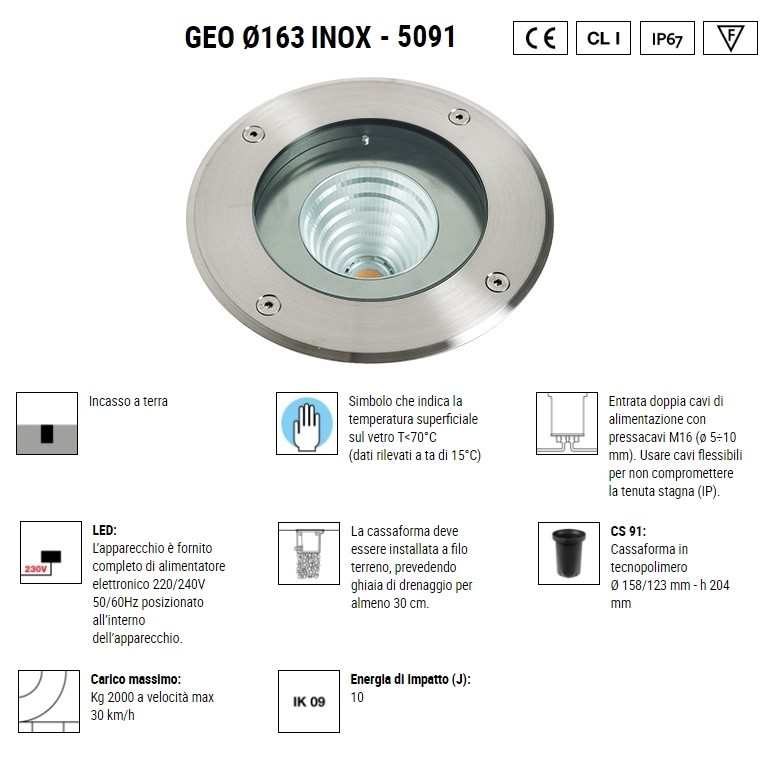 BOLUCE – Geo 163 Inox è una lampada per esterno fornita di cassaforma per incasso a pavimento, disponibile con COB LED integrato da 13,7w 3000K 2000lm o 4000K 2070lm e l'opportunità di scelta tra ottica da 16° 40° 74°. Geo 163 Inox se istallata correttamente e secondo istruzioni di montaggio, ha un grado IP67 e vi permetterà di illuminare i vostri spazi esterni, il vostro giardino, il terrazzo, la veranda e il vostro outdoor.