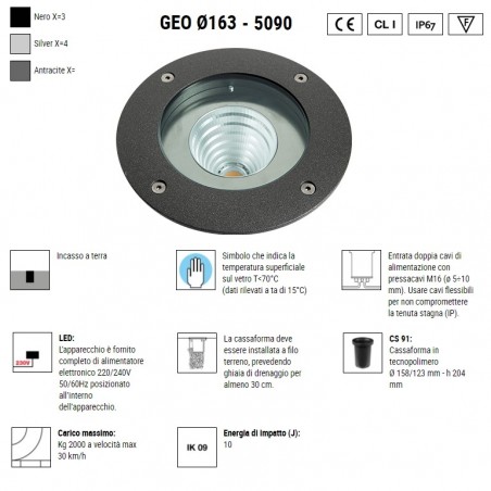 BOLUCE – Geo 163 è una lampada per esterno fornita di cassaforma per incasso a pavimento, disponibile in diversi colori, con COB LED integrato da 13,7w 3000K 2000lm o 4000K 2070lm e l'opportunità di scelta tra ottica da 16° 40° 74°. Geo 163 se istallata correttamente e secondo istruzioni di montaggio, ha un grado IP67 e vi permetterà di illuminare i vostri spazi esterni, il vostro giardino, il terrazzo, la veranda e il vostro outdoor.