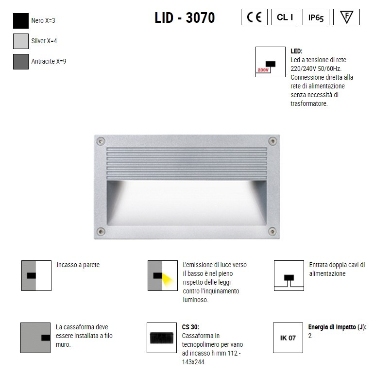 BOLUCE – Lid 3070 è una lampada per esterno e interno in alluminio, fornita di cassaforma per incasso a parete, disponibile in colori diversi e Led integrato da 13w 1790lm con l’opzione di scelta tra 3000K e 4000K. Lid, se istallata correttamente e secondo istruzioni di montaggio, ha un grado IP65 e vi permetterà di illuminare i vostri spazi esterni, il vostro giardino, il terrazzo, la veranda e il vostro outdoor, ma anche interni abitativi come corridoi, scale, disimpegni, o addirittura come luce morbida e rilassante in sala e soggiorno.