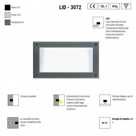 BOLUCE – Lid 3072 è una lampada per esterno e interno in alluminio, fornita di cassaforma per incasso a parete, disponibile in colori diversi e Led integrato da 9w 1160lm con l’opzione di scelta tra 3000K e 4000K, oppure con classico portalampada E27 e la possibilità di utilizzare lampadine da 60W Alogene o Led compatibili con dimensioni e spazi. Lid, se istallata correttamente e secondo istruzioni di montaggio, ha un grado IP65 e vi permetterà di illuminare i vostri spazi esterni, il vostro giardino, il terrazzo, la veranda e il vostro outdoor, ma anche interni abitativi come corridoi, scale, disimpegni, o addirittura come luce morbida e rilassante in sala e soggiorno.