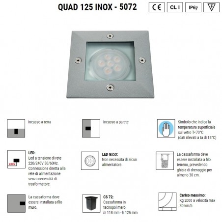 BOLUCE – Quad 125 Inox è una lampada per esterno e interno fornita di cassaforma per incasso a pavimento dotata di portalampada GU10 e lampadina LED da 6w a scelta tra 3000K e 4000K. Quad 125 Inox se istallata correttamente e secondo istruzioni di montaggio, ha un grado IP67 e vi permetterà di illuminare i vostri spazi esterni, il vostro giardino, il terrazzo, la veranda e il vostro outdoor, ma anche interni abitativi come corridoi, scale, disimpegni e zone di passaggio.