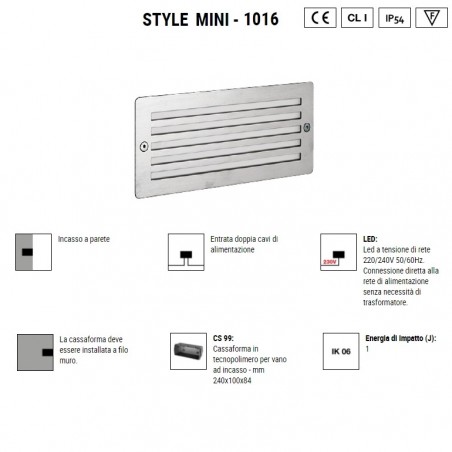 BOLUCE – Style Mini 1016 è una lampada per uso esterno e interno fornita di cassaforma per incasso a parete, con cornice in acciaio Inox AISI 316 e dotata di Led integrato da 9w 3000K 1160lm o 4000K 1240lm, oppure a scelta con tradizionale portalampada E14 e la possibilità di usare lampadine alogene da 40W o Led, compatibili con dimensioni e spazi interni. Style Mini 1016 incasso, se istallata correttamente e secondo istruzioni di montaggio, ha un grado IP54 e vi permetterà di illuminare i vostri spazi esterni, il vostro giardino, il terrazzo, la veranda, il vialetto e in generale il vostro outdoor, ma anche interni come scale, corridoi, disimpegni e ovunque vogliate inserire luci da incasso per creare un ambiente moderno e accogliente.