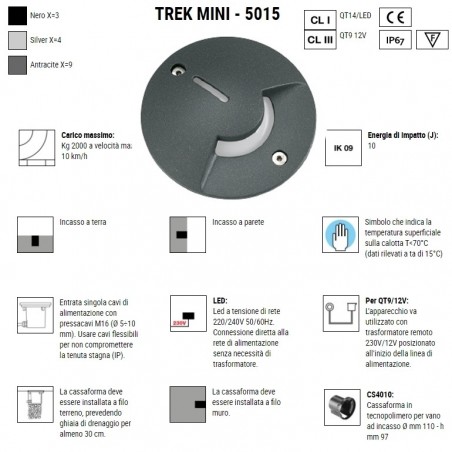 BOLUCE – Trek Mini 5015 è una lampada per esterno da incasso a pavimento carrabile, corredata di cassaforma e disponibile in colori diversi. Trek Mini 5015 è fornita a scelta di Led integrato da 4w 3000K 400lm o 4000K 420lm e se istallata correttamente, secondo le istruzioni di montaggio, ha un grado IP67 che vi garantisce una perfetta tenuta contro acqua e agenti atmosferici, ideale per il viale di casa, o il passo carrabile d’accesso al Box.
