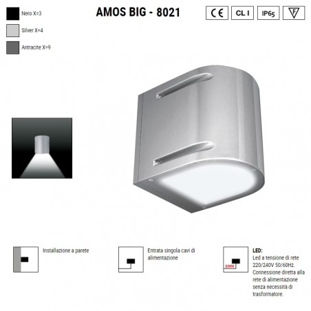 BOLUCE – Amos Big 8021, disponibile con diverse finiture colore, è una lampada da parete in pressofuso d'alluminio per esterno ad emissione monodirezionale, con possibilità di sorgente luminosa Led da 13w che può essere a scelta con temperatura colore 3000K o 4000K 1790lm, oppure con normale portalampada E27 adatto all'uso di lampadine alogene da 100w o Led compatibilmete con dimensioni e spazi interni alla lampada. Amos Big 8021 se istallata correttamente e secondo istruzioni di montaggio, ha un grado IP65 e vi permetterà di illuminare i vostri spazi esterni, la veranda, il porticato, giocando con effetti luce che non mancheranno di valorizzare il vostro outdoor.