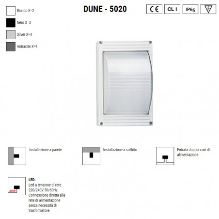 BOLUCE – Dune è una lampada da parete per esterno in pressofuso d’alluminio con diffusore in vetro, disponibile in colori diversi e dotata di un Led da 13w a scelta 3000K o 4000K 1790lm, oppure con tradizionale portalampada E27 adatto all’uso di lampadine non incluse da 100w alogene, o Led compatibili con dimensioni e spazi interni alla lampada. Dune se istallata correttamente e secondo istruzioni di montaggio, ha un grado IP65 e vi permetterà di illuminare i vostri spazi esterni come la veranda, il porticato, il terrazzo, la facciata o i balconi e valorizzare il vostro outdoor.