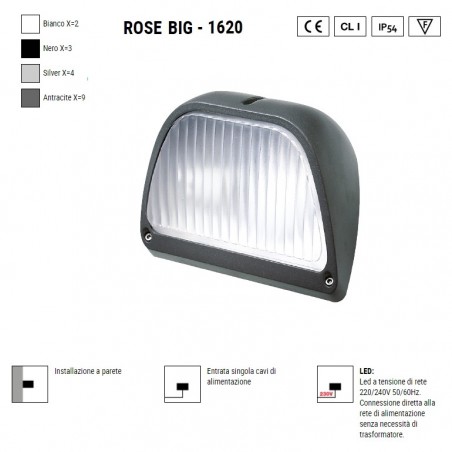 BOLUCE – Rose Big è una lampada da parete per esterno in pressofusione d’alluminio con diffusore in policarbonato, disponibile in diversi colori e dotata di un Led integrati da 13w che può essere a scelta con 3000K o 4000K 1790lm, oppure con un classico portalampada E27 adatto all’uso di lampadine non incluse da 75w alogene, o Led compatibili con dimensioni e spazi interni alla lampada. Questa lampada, con grado IP54, vi permetterà di illuminare i vostri spazi esterni come la veranda, il porticato, il terrazzo, la facciata o i balconi e valorizzare il vostro outdoor.