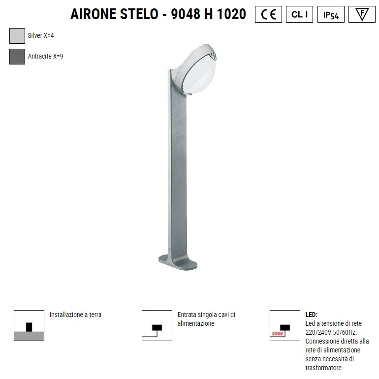 BOLUCE – Airone stelo con una luce, opzionabile in due diverse altezze, è una lampada per istallazione a terra in pressofuso d’alluminio con diffusore in policarbonato. Disponibile in colori diversi, la lampada può essere a scelta dotata di Led integrato da 9w con temperatura colore 3000K 1160lm o 4000K 1240lm, oppure con classico portalampada E27 che permette l’uso di lampadine, non incluse, da 75w alogene o Led compatibili con dimensioni e spazi interni alla lampada. Questa lampada, con grado IP54, vi permetterà di illuminare i vostri spazi esterni come prati, viali e angoli particolari del vostro outdoor.