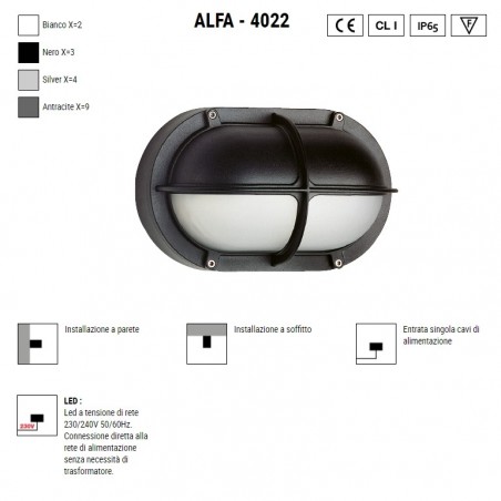 BOLUCE – Alfa Oval 4022 è una lampada per illuminazione da esterno a parete, realizzata in alluminio pressofuso e vetro, disponibile in più finiture di colore e dotata a scelta ho di un Led integrato da 13W con temperatura colore 3000K o 4000K 1790m, oppure con classico portalampada E27 che permette l’utilizzo di lampadine, non incluse, da 75w alogene, o LED compatibili con dimensioni e spazi interni alla lampada. Alfa Oval 4022, dalla forma decisamente moderna e con grado IP65, vi permetterà di illuminare con personalità ed eleganza i vostri spazi esterni come balconi, verande, terrazzi, porticati e angoli particolari del vostro outdoor.