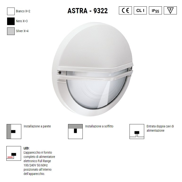 BOLUCE – Astra 9322 è una lampada per illuminazione da esterno utilizzabile a parete, realizzata in alluminio pressofuso e vetro, disponibile in più finiture di colore e dotata a scelta ho di un Led integrato da 17W con temperatura colore 3000K o 4000K 2300lm, oppure con classico portalampada E27 che permette l’utilizzo di lampadine, non incluse, da 75w alogene, o LED compatibili con dimensioni e spazi interni alla lampada. Astra 9322, dalla forma decisamente moderna e con grado IP55, vi permetterà di illuminare con personalità ed eleganza i vostri spazi esterni come balconi, verande, terrazzi, porticati e angoli particolari del vostro outdoor.