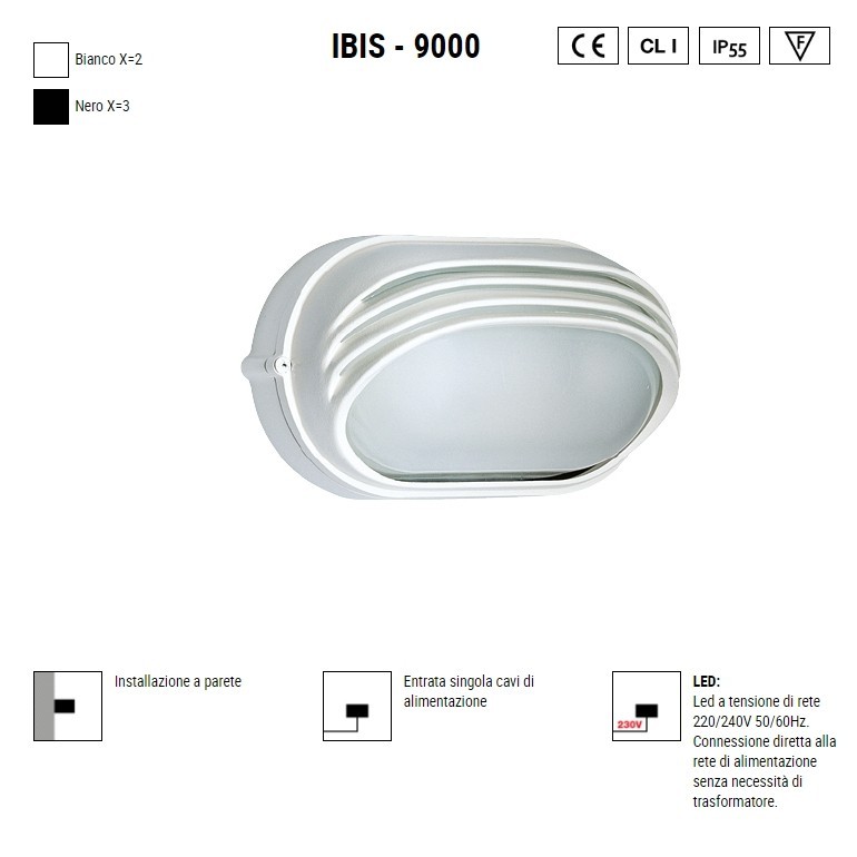 BOLUCE – Ibis 9000 è una lampada parete per illuminazione da esterno, realizzata in alluminio pressofuso e vetro, disponibile in più finiture di colore e dotata a scelta ho di un Led integrato da 13W con temperatura colore 3000K o 4000K 1790lm, oppure con classico portalampada E27 che permette l’utilizzo di lampadine, non incluse, da 75w alogene, o LED compatibili con dimensioni e spazi interni alla lampada. Ibis 9000, di forma classica e con grado IP55, vi permetterà di illuminare con personalità ed eleganza i vostri spazi esterni come balconi, verande, terrazzi, porticati e angoli particolari del vostro outdoor.