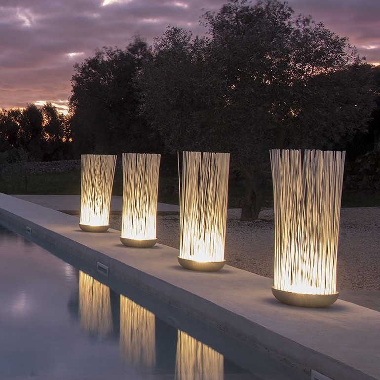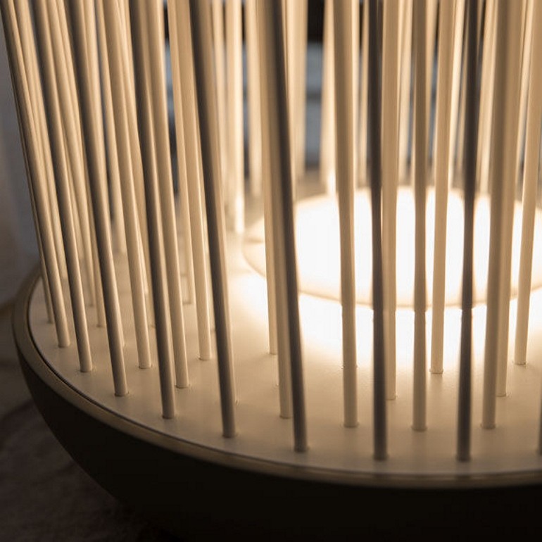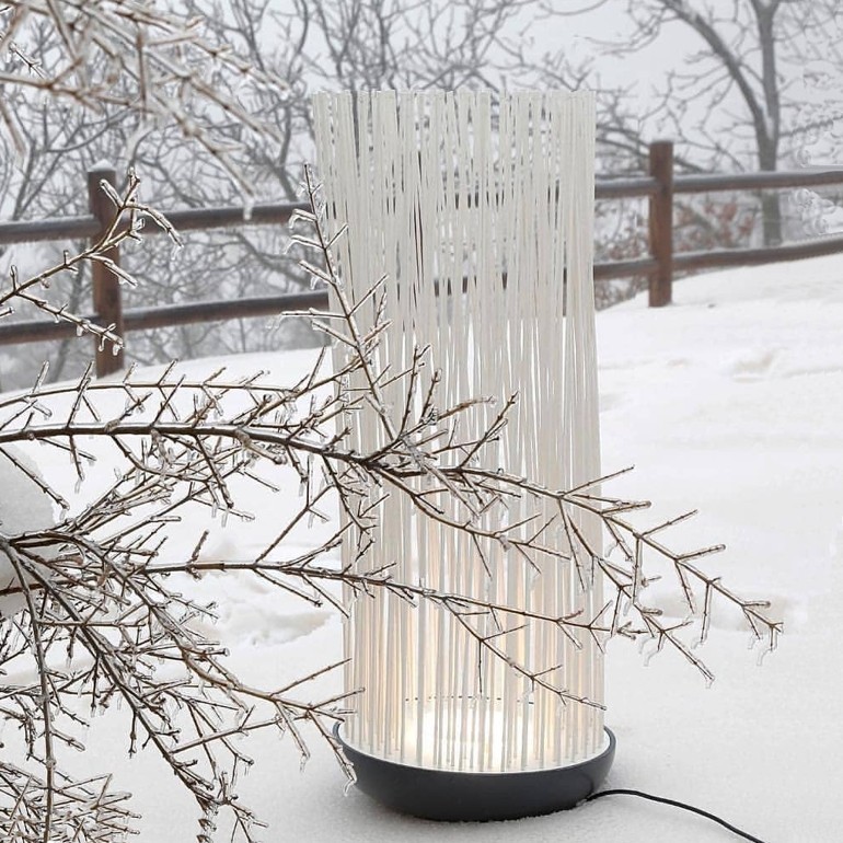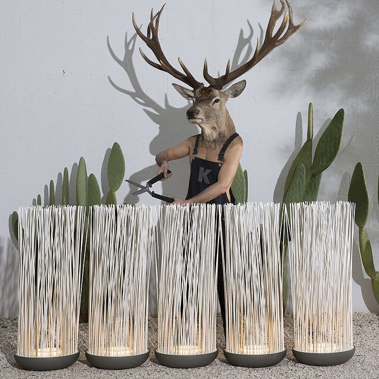 KARMAN – Con la lampada Don’t Touch outdoor è possibile rendete gli esterni un luogo unico e straordinario. Specialmente ideata per resistere in esterno con un grado IP65, questa lampada si compone di una base leggermente arrotondata in tecnopolimero color grigio opaco, sulla quale si appoggiano diversi steli lineari in PVC bianco. Questa disposizione originale può essere lasciata così, con gli steli liberi, o raccolti con l'aiuto di un anello in silicone (fornito in dotazione). La sorgente luminosa di Don’t Touch, un Led da 20w 2179lm con possibilità a scelta di luce 3000K o 2700k, posto nella base crea tra gli steli un suggestivo scenario di luce.