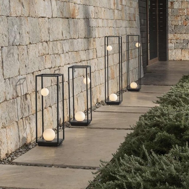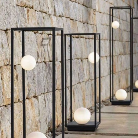 KARMAN – Abachina Outdoor è una lampada da esterno, una contemporanea lanterna a led da terra, con struttura metallica a parallelepipedo in alluminio verniciato in bianco o nero opachi, sul cui telaio sono ben ancorate delicate sfere in bianco vetro soffiato, dai diversi diametri. Poggiate per creare atmosfera in giardino, hanno il plus opzionale di un piccolo vassoio sulla sommità: piano d’appoggio per vasi, piccoli oggetti o dispositivi elettronici poiché provvisto di foro per passaggio cavi. Dotata di due sorgenti led da 3,2w 410lm e 7,4w 958lm con temperatura colore 3000K.