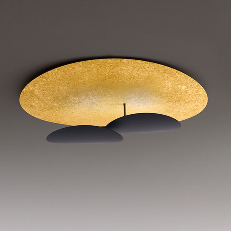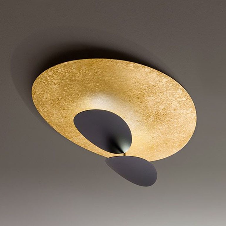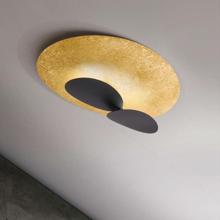 ICONE – Masai soffitto proposta in differenti finiture colore è una lampada caratterizzata da un design originale e molto scenografico, adatto ad arredare e rendere esclusivi gli ambienti dove la si intende collocare. Dotata di due luci Led da 20W ciascuna per un totale di 40w 3840lm 3000°K che si riflettono sulla grande foglia. Una plafoniera dalle notevoli dimensioni adatta per arredare ambienti living come sale e soggiorni moderni.