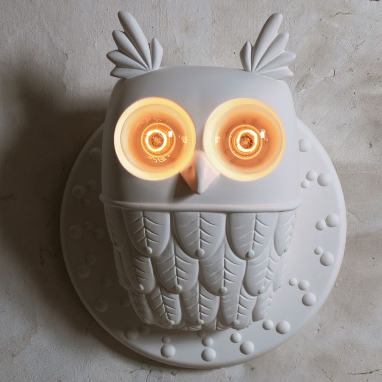 KARMAN – Ti-Vedo, realizzata in ceramica, è una lampada da parete scolpita in rilievo per rappresentare un simpatico e divertente gufo, con due lampadine a raffigurare gli occhi dell'uccello che scrutano nel buio. Ironico come nello stile Karman, quest'applique arreda la parete in modo insolito, creando un mondo fantastico e diffondendo una morbida luce d'ambiente. Dotato di due portalampada E27 si possono utilizzare lampadine decorative, non incluse, da 53w, tuttavia si consiglia l'uso di lampadine LED a filamento.
