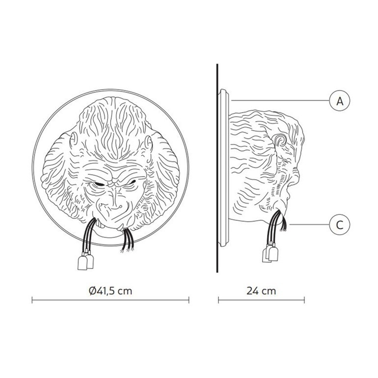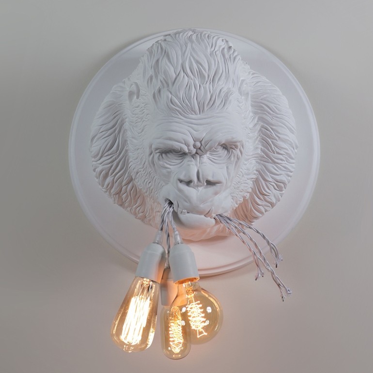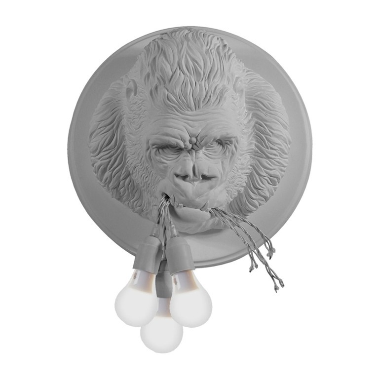 KARMAN – Ugo Rilla, realizzata in ceramica, è una lampada da parete scolpita in rilievo per rappresentare un'enorme testa di Gorilla dal realismo sorprendente. L'animale tiene in bocca tre luci a LED, come se le avesse appena strappate dopo un attacco di rabbia spaventosa! Divertente e provocante come nello stile Karman, quest'applique arreda la parete in modo insolito, creando un mondo sia onirico che fantastico, diffondendo una morbida luce d'ambiente. Le lampadine utilizzabili devono essere esclusivamente Led max 10w E27 di tipo plastico e non incluse.